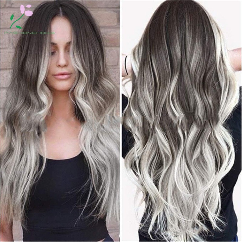 Women Gradient Balck Grey Long Curly Wig Synthetic Wavy Hair Heat